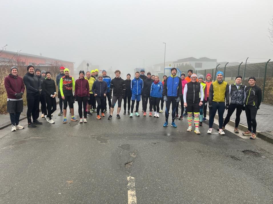 Die Hand vor Augen kann ich noch gut erkennen. Auch wenn die Sonne es nicht schafft, die Wolken zu durchdringen, lässt der Nebel diese Sicht zu. Pünktlich zum Start um 10 Uhr findet sich eine unermüdliche Läuferschar zusammen, um Bad Driburg zum Jahresabschluss zu umrunden. Unterstützung für den Lauf bekommen Bernhard und Frank heute durch Michael, der am Reelser Kreuz Tee ausschenken wird. Bevor wir auf die Strecke gelassen werden, wird sorgfältig festgehalten, wer wo startet. Zur Auswahl stehen, wie üblich drei vorgegebene Varianten und eine individuelle Entscheidung. Vorgegeben sind ab Wasserhydrant für die komplette Strecke. Eine nostalgische Bezeichnung für den Eingang am Gewerbegebiet Süd, denn er ist vor Jahren abgebaut worden. Dann ab Hepp, um sich die herausfordernde Steigung hinauf auf den Eggekamm zu ersparen und ab Reelser Kreuz, um die finalen Kilometer ab Rosenberg abzuspulen. Nachdem diese Formalität erledigt ist muss nur noch das Startfeld abgelichtet werden bevor Frank routiniert den Startschuss mittels Böller abgibt.